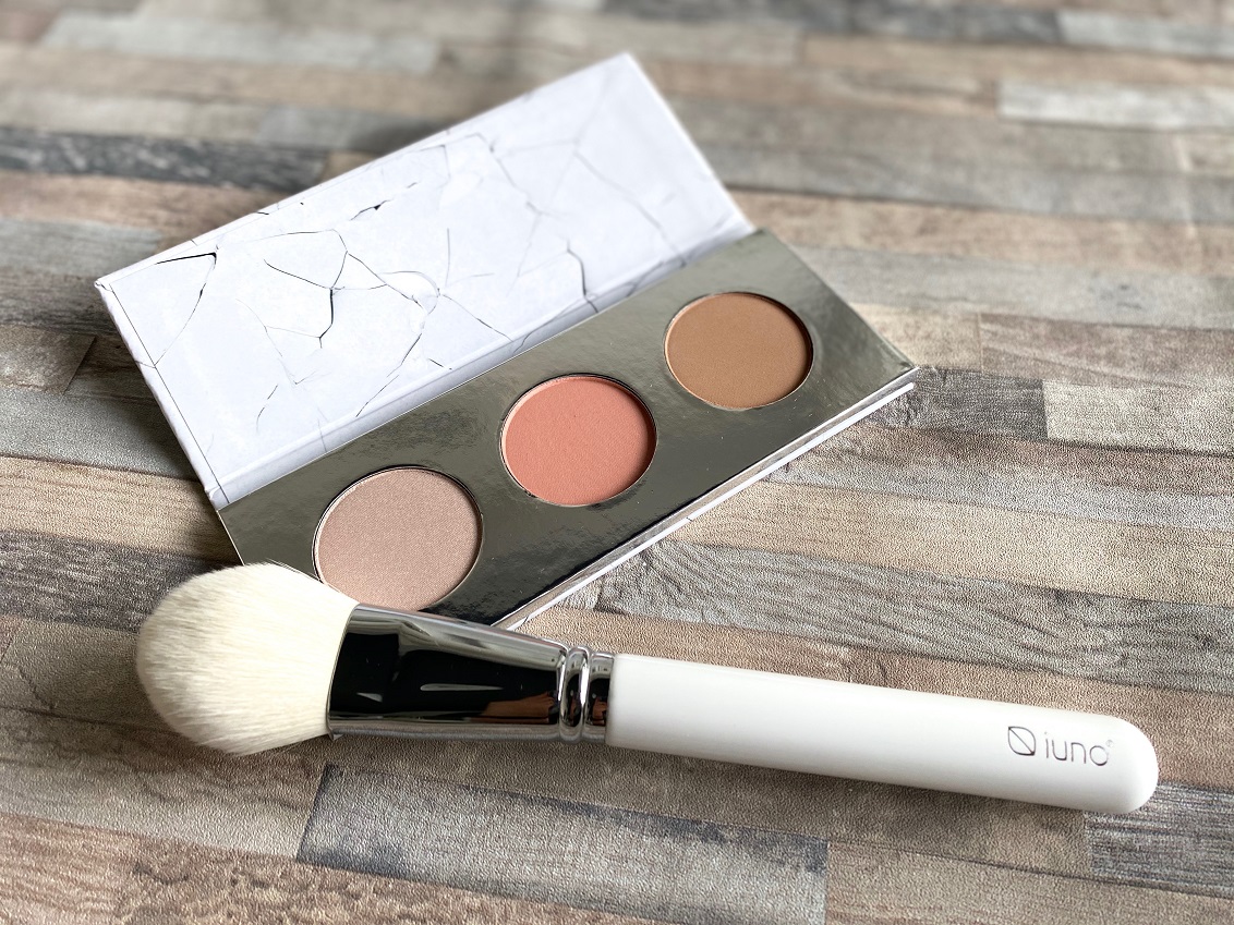 Następnie sięgamy po zestaw do modelowania owalu twarzy zamknięty w bardzo praktycznym opakowaniu. Mamy tu trzy produkty: bronzer, róż i rozświetlacz – wszystko w wersji wegańskiej i z naturalnymi składnikami.